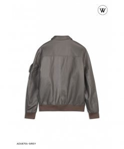 ÁO KHOÁC DA GHI XÁM 2 TÚI HỘP IN CHỮ NGỰC TRÁI